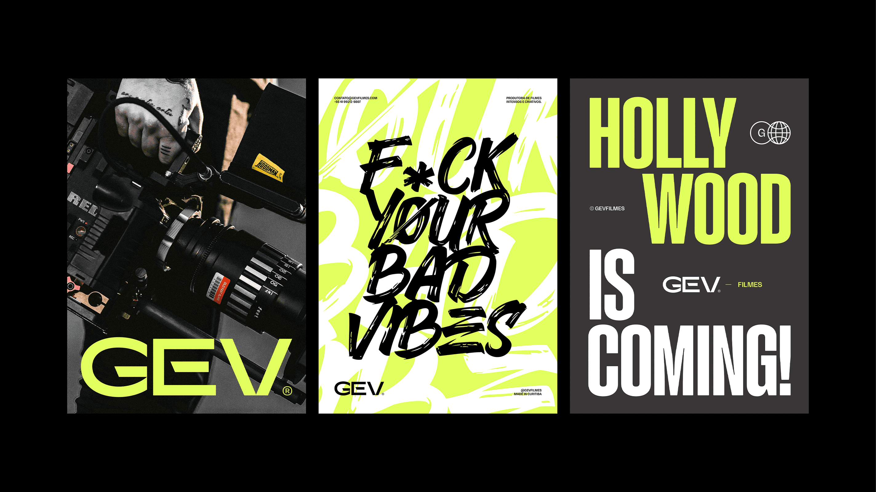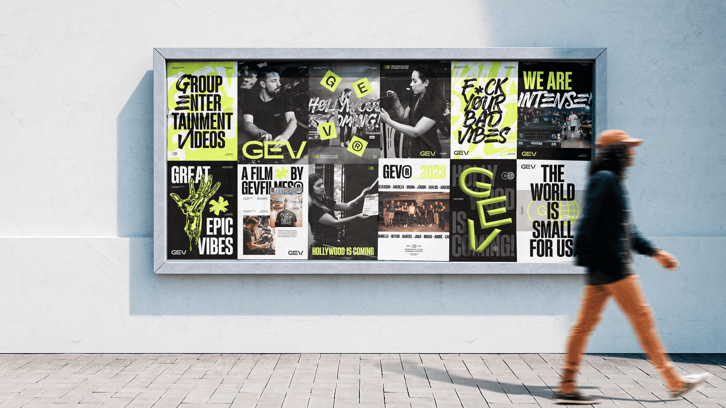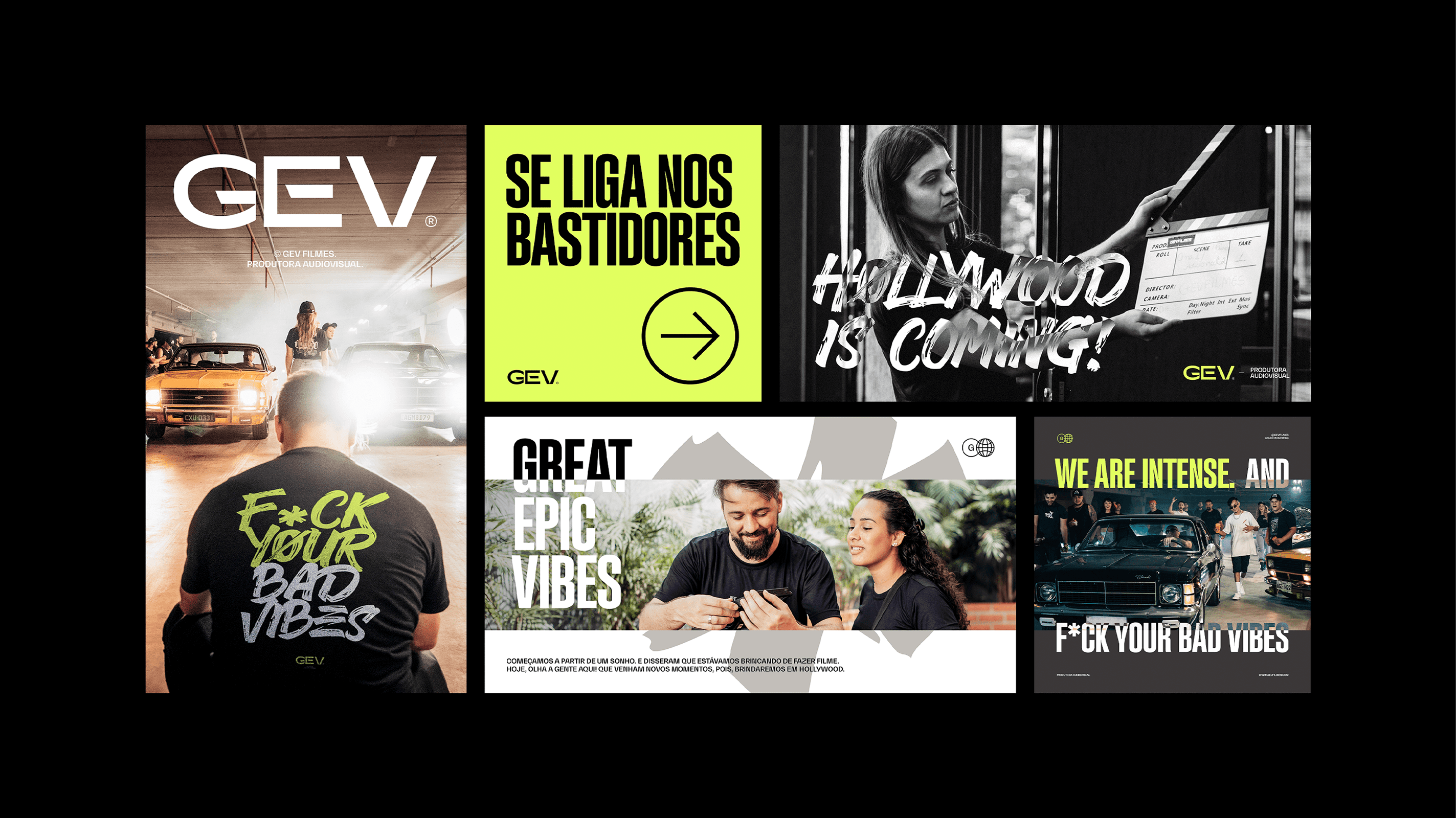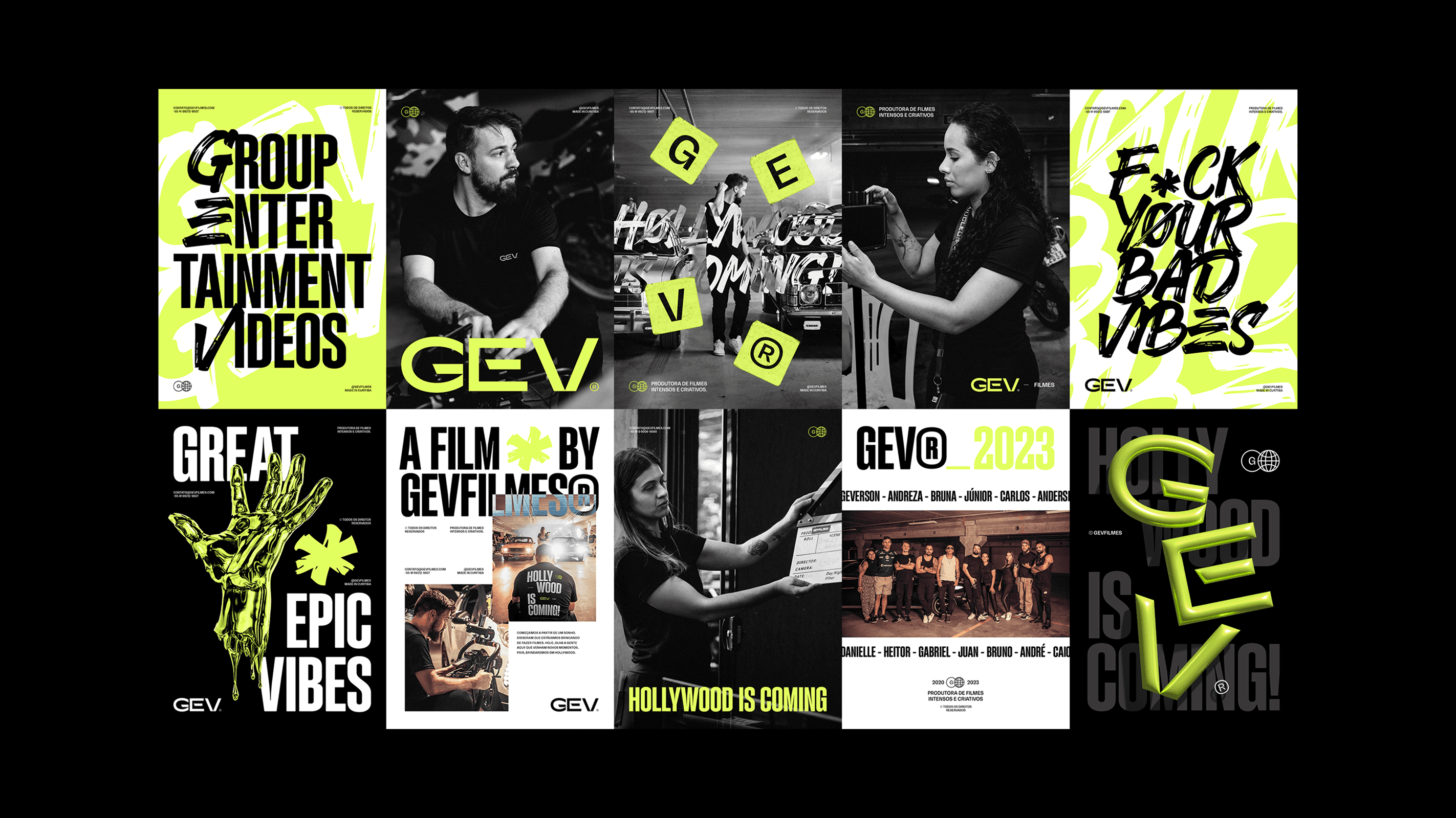 The applications demonstrate the full strength of the identity: bold posters, large-scale typography, expressive corporate materials and a dominant social-media presence. The system remains cohesive across business cards, badges, packaging, editorial layouts, promotional pieces and physical merchandise, reinforcing GEV Filmes as a production company that delivers impact, quality and authenticity at every touchpoint.