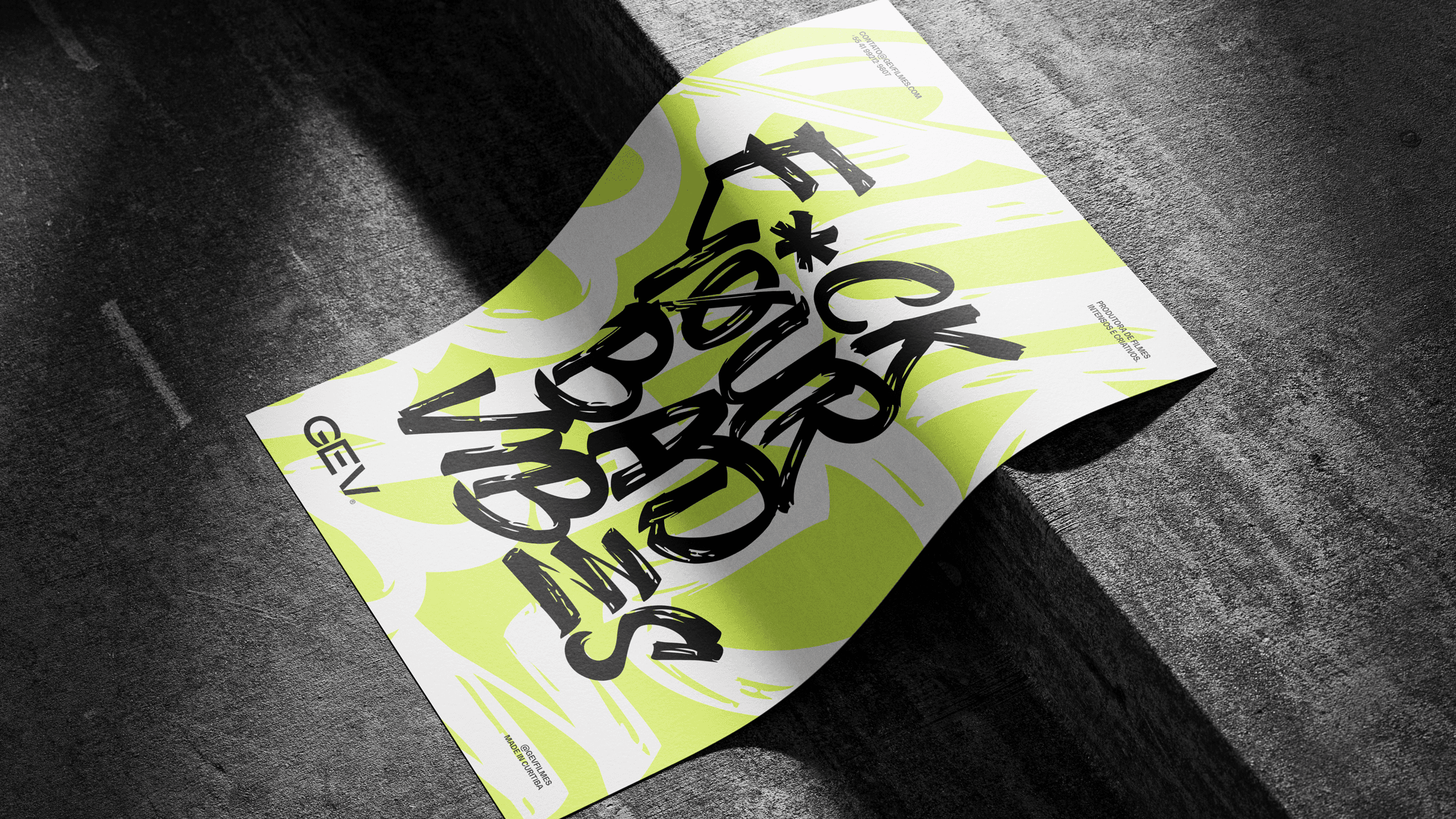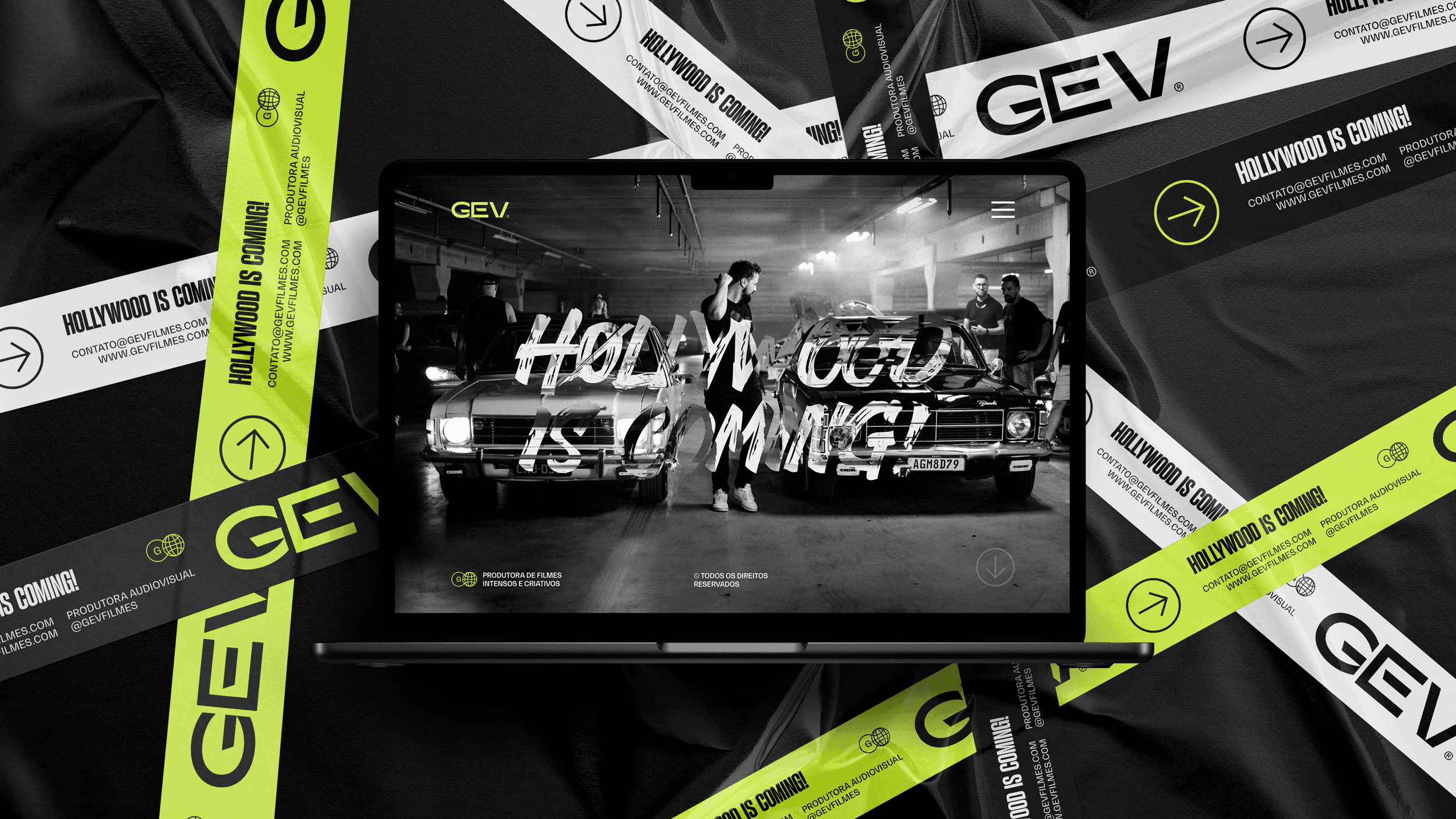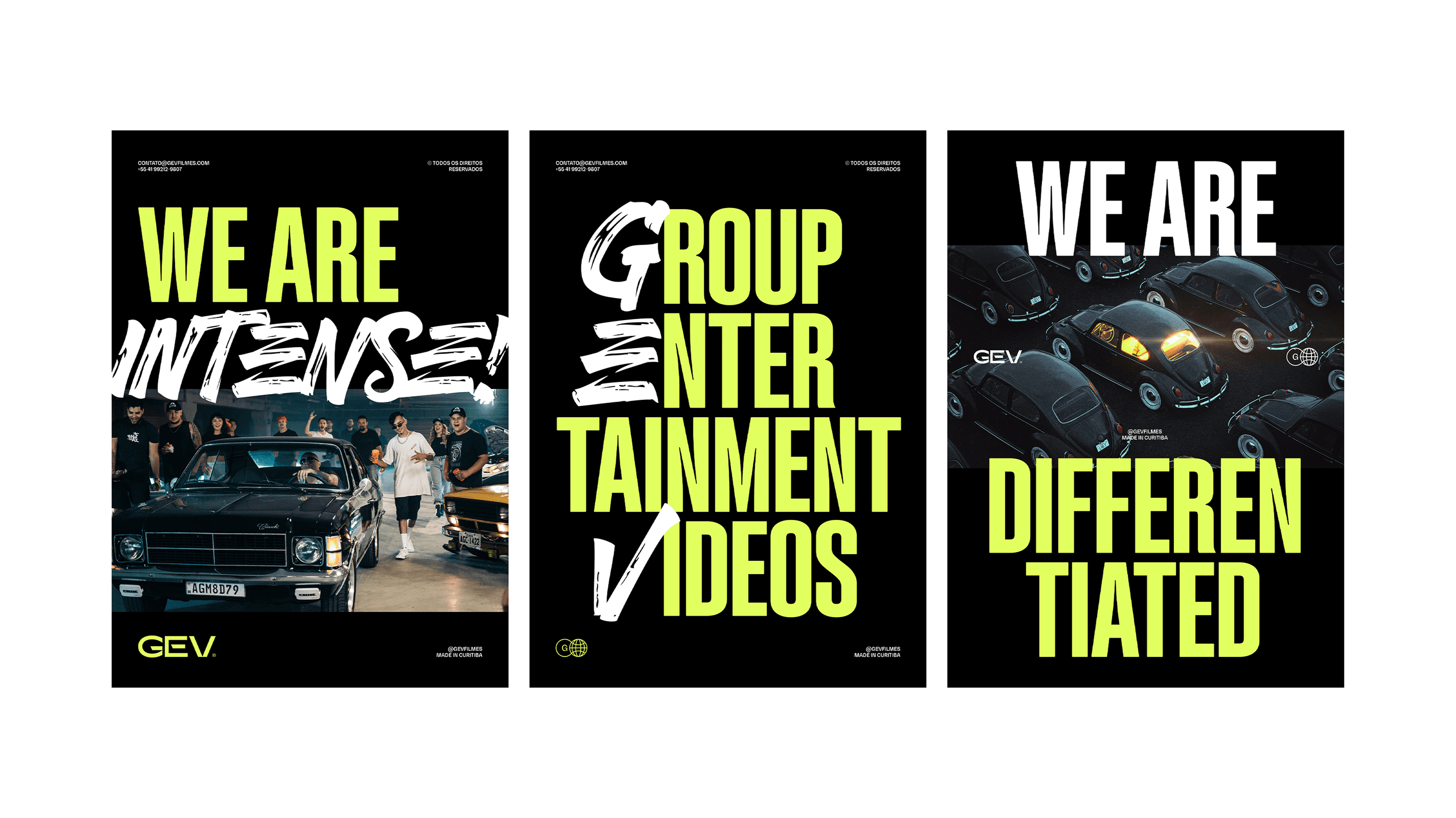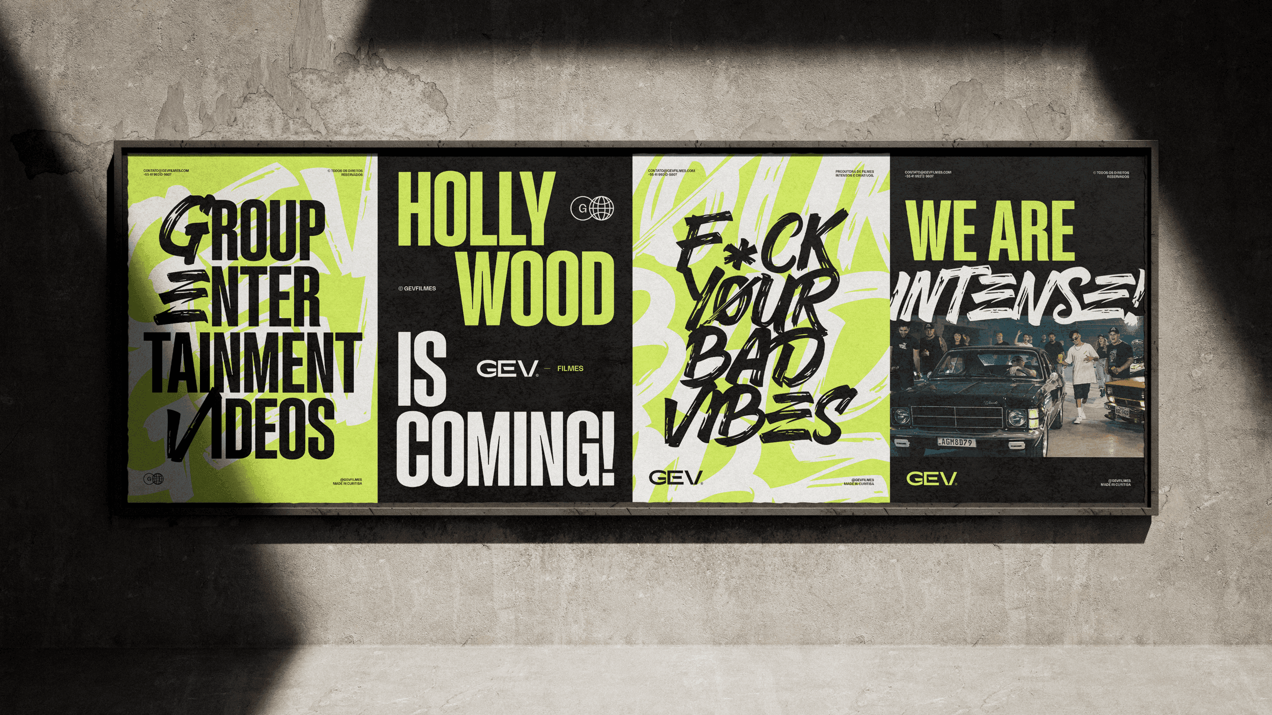 The applications demonstrate the full strength of the identity: bold posters, large-scale typography, expressive corporate materials and a dominant social-media presence. The system remains cohesive across business cards, badges, packaging, editorial layouts, promotional pieces and physical merchandise, reinforcing GEV Filmes as a production company that delivers impact, quality and authenticity at every touchpoint.