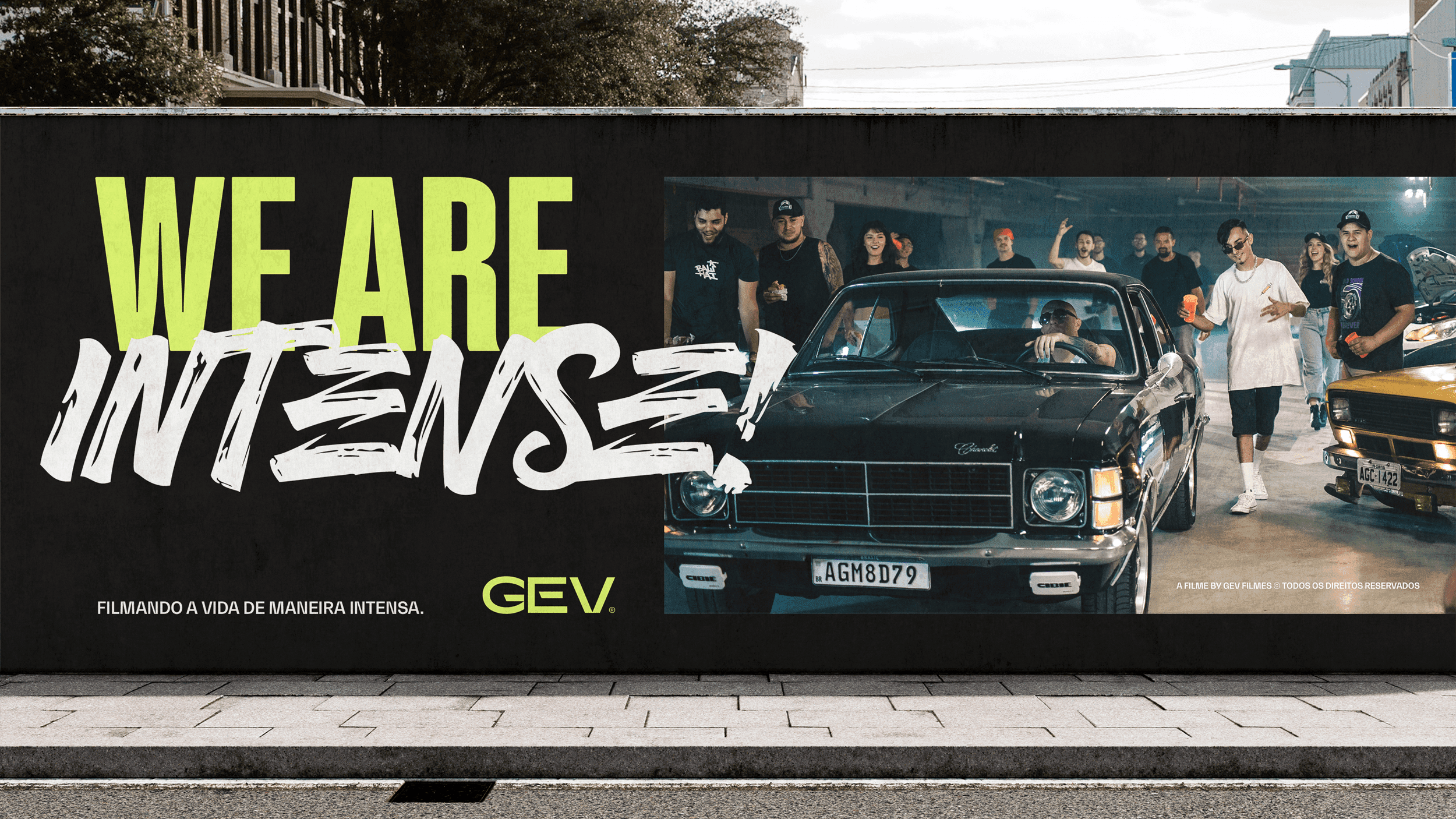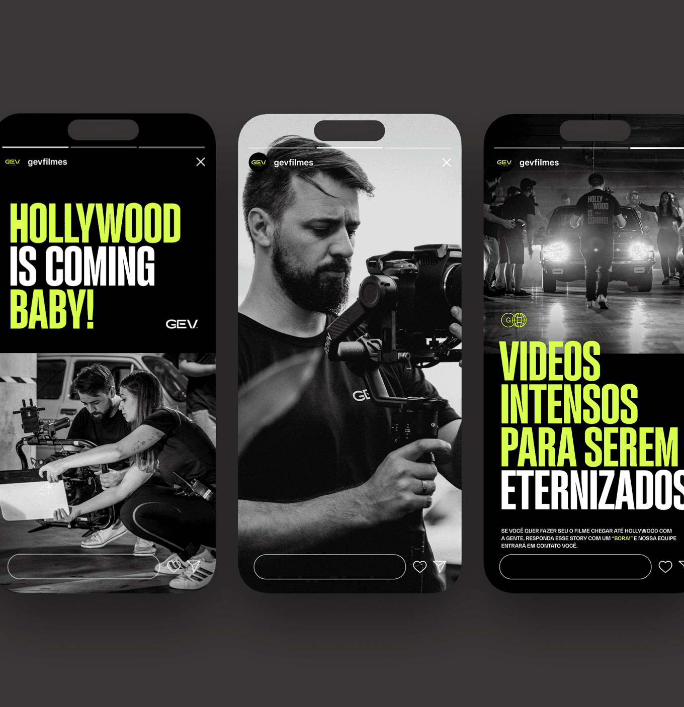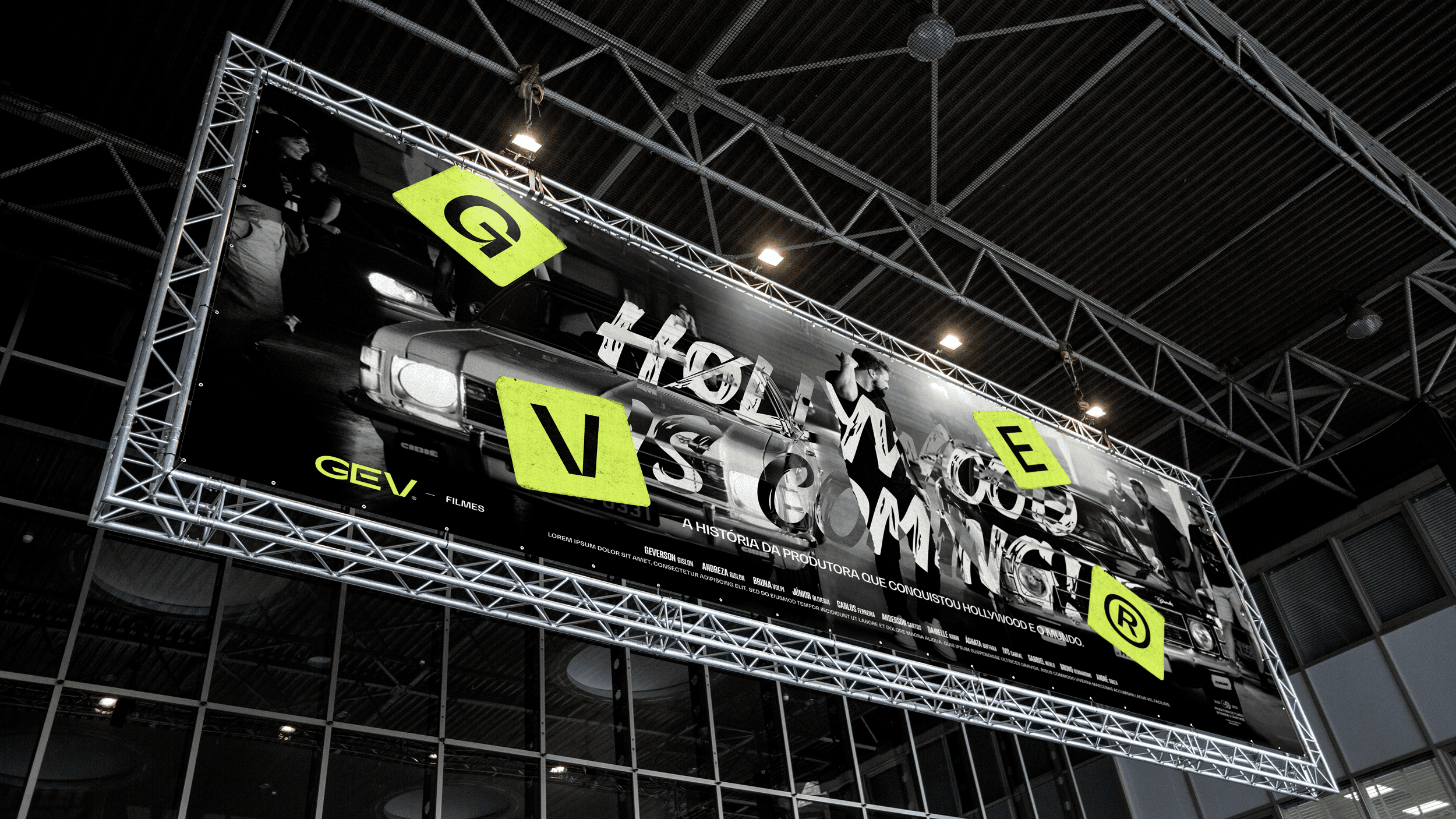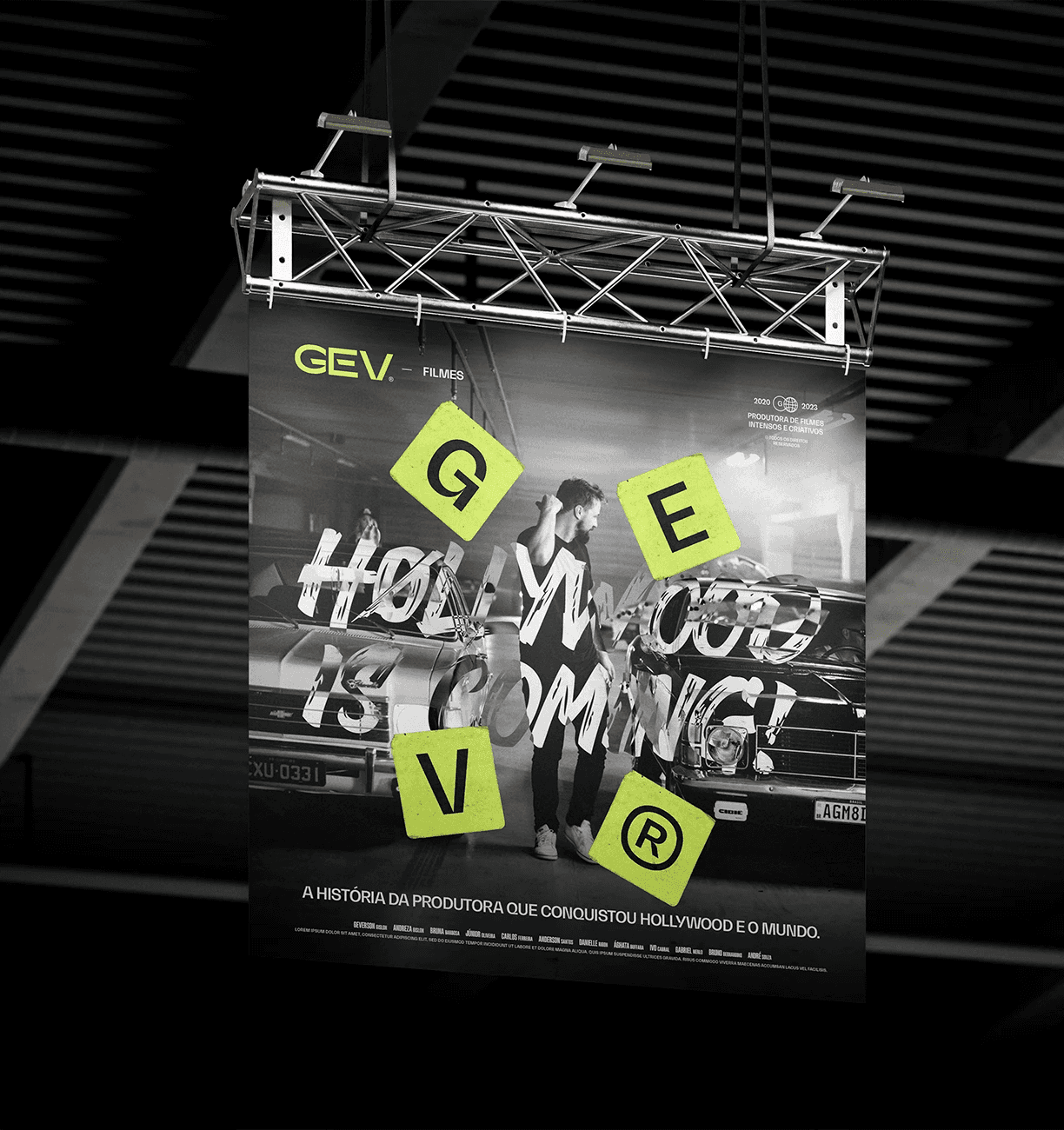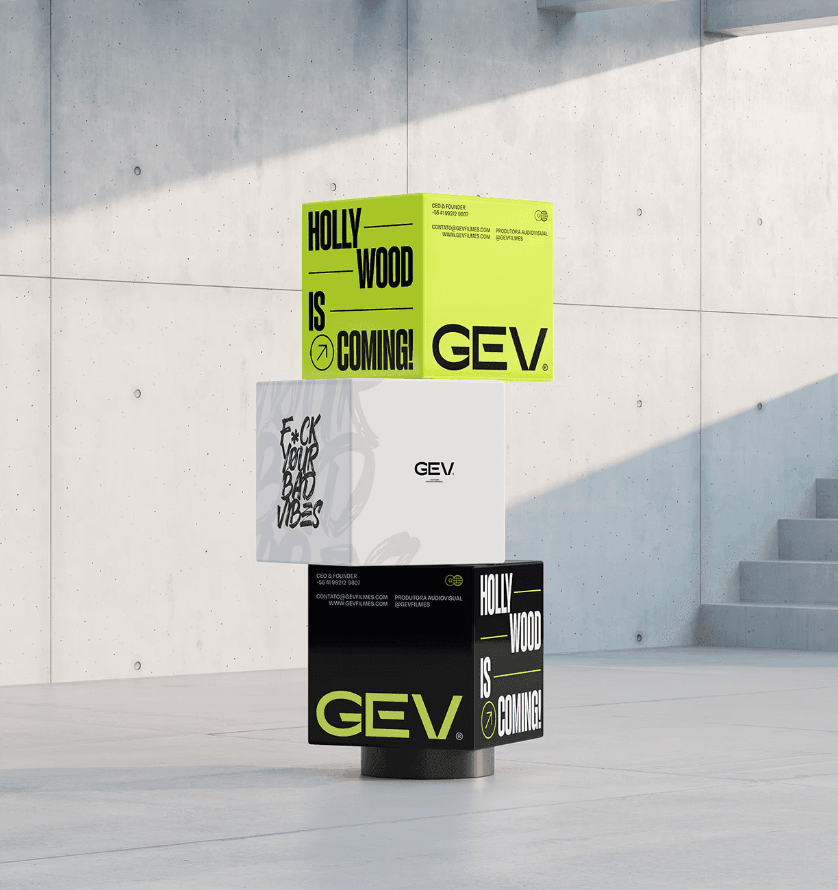 The applications demonstrate the full strength of the identity: bold posters, large-scale typography, expressive corporate materials and a dominant social-media presence. The system remains cohesive across business cards, badges, packaging, editorial layouts, promotional pieces and physical merchandise, reinforcing GEV Filmes as a production company that delivers impact, quality and authenticity at every touchpoint.