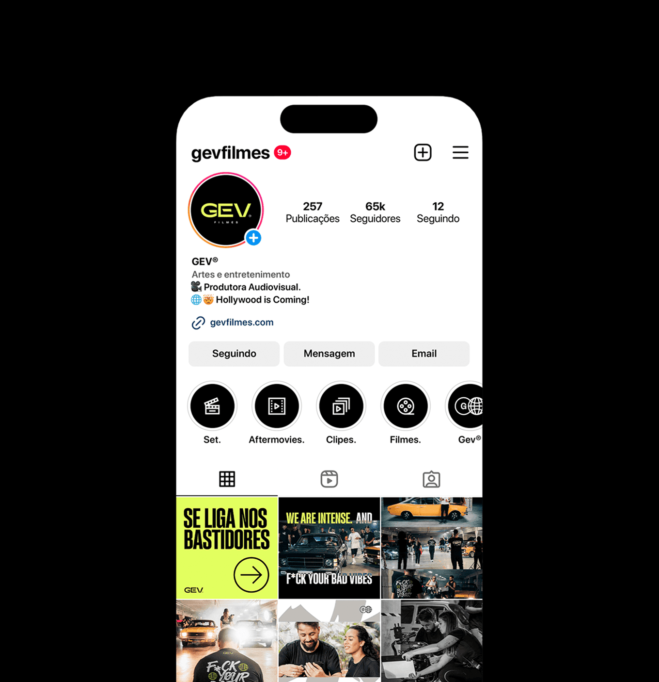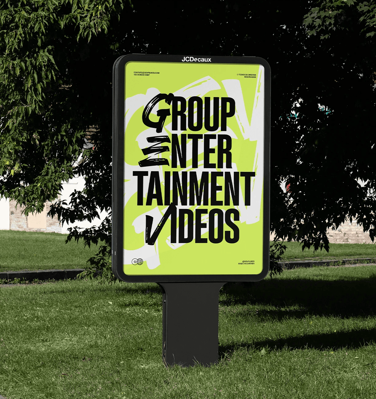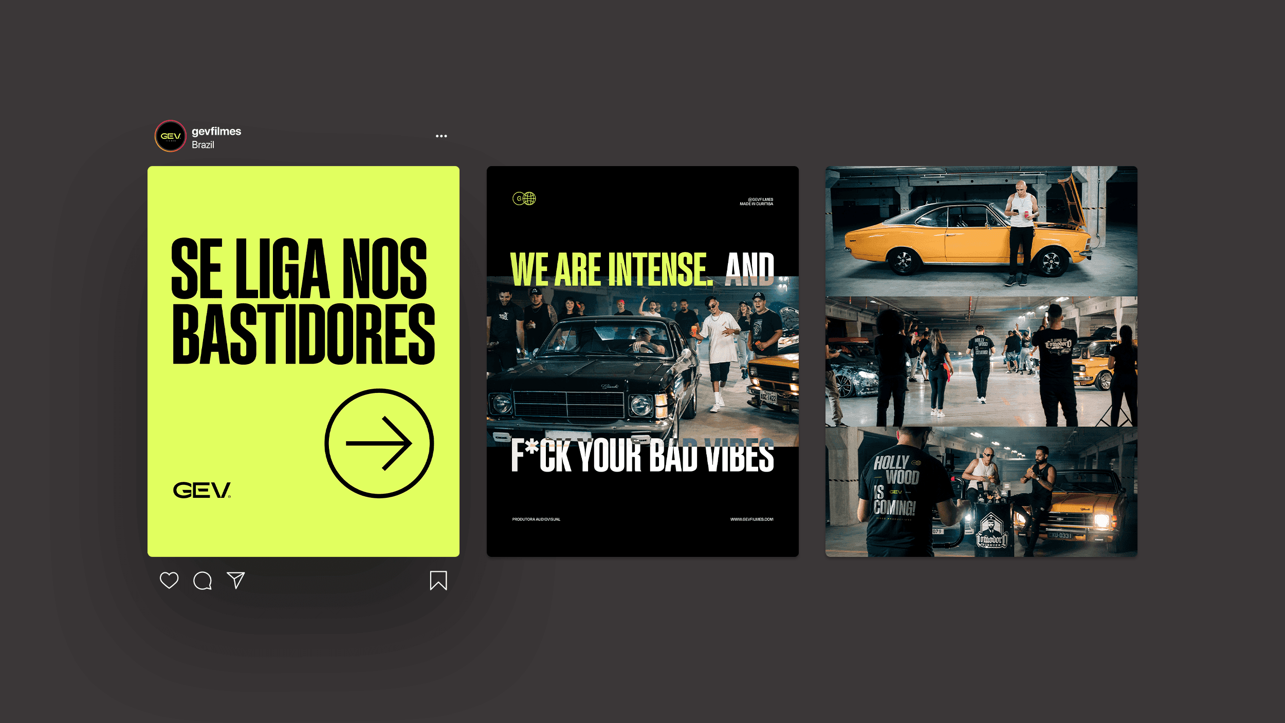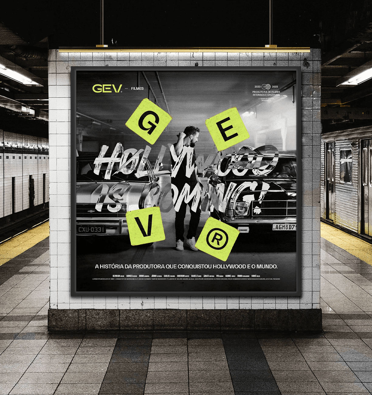 The applications demonstrate the full strength of the identity: bold posters, large-scale typography, expressive corporate materials and a dominant social-media presence. The system remains cohesive across business cards, badges, packaging, editorial layouts, promotional pieces and physical merchandise, reinforcing GEV Filmes as a production company that delivers impact, quality and authenticity at every touchpoint.