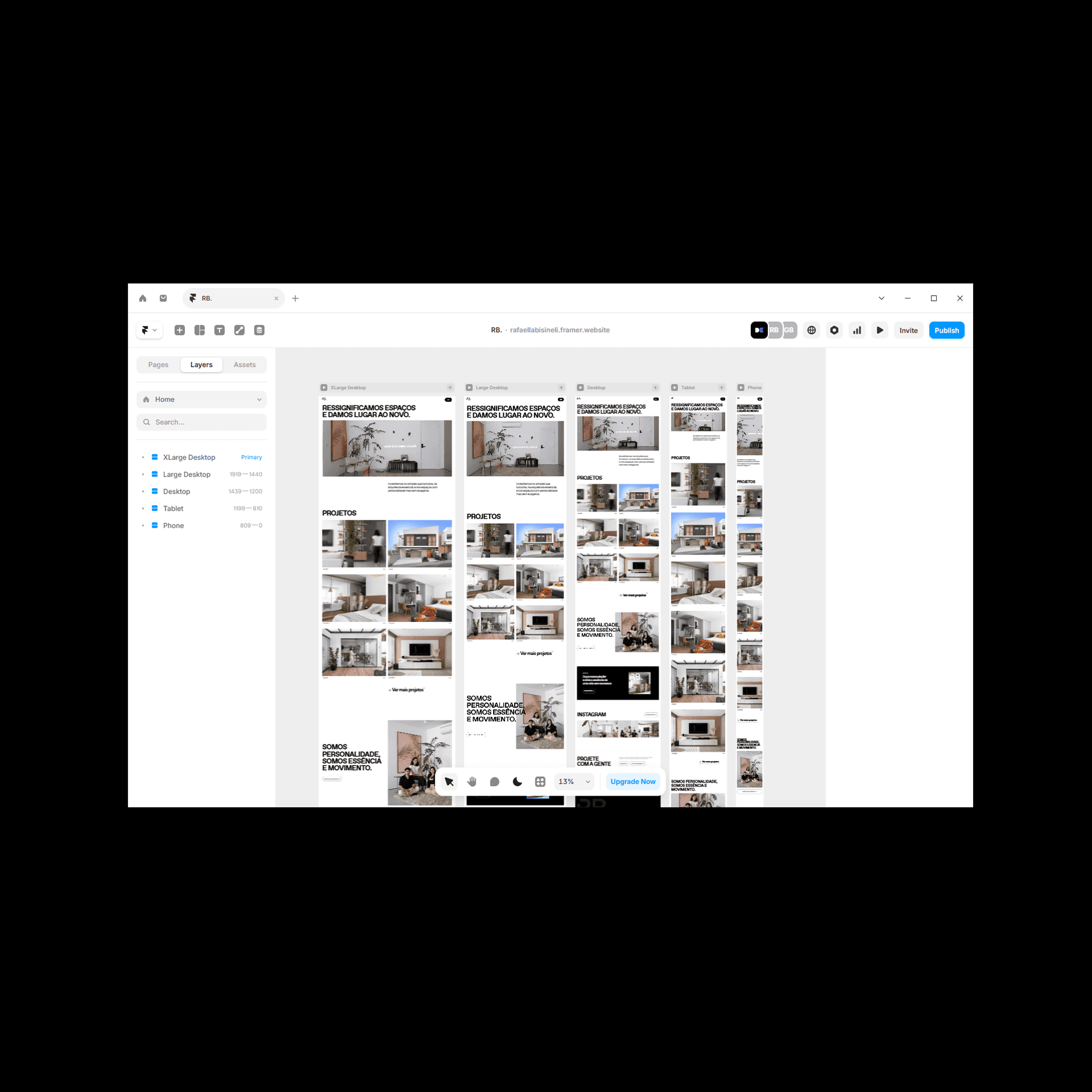 The solution integrates a minimalist structure with strategic usability choices. Each breakpoint is meticulously organized, ensuring responsive behavior across devices. Modular sections allow content to adapt seamlessly, while the information architecture emphasizes flow, readability, and a strong visual hierarchy. Within Framer, updates such as adding new projects, adjusting layouts, or modifying text can be done quickly and without technical barriers.